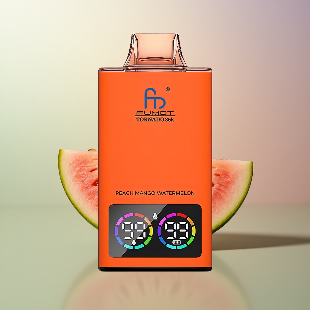 Fumot Tornado 35000 Großhandel Deutschland Pfirsich Mango Wassermelone Dual Mesh Coil RGB Lichter 15ml Saft 700 MAH USB-C Schnellladung